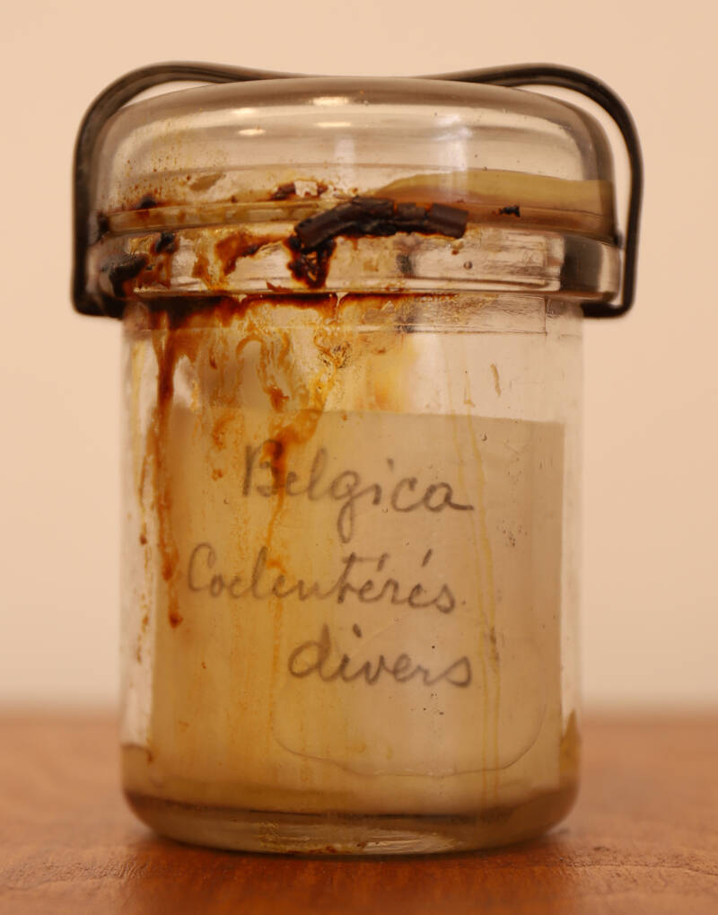 Gamelă de la bordul vasului Belgica și câteva dintre piesele botanice păstrate în săculeți și etichetate