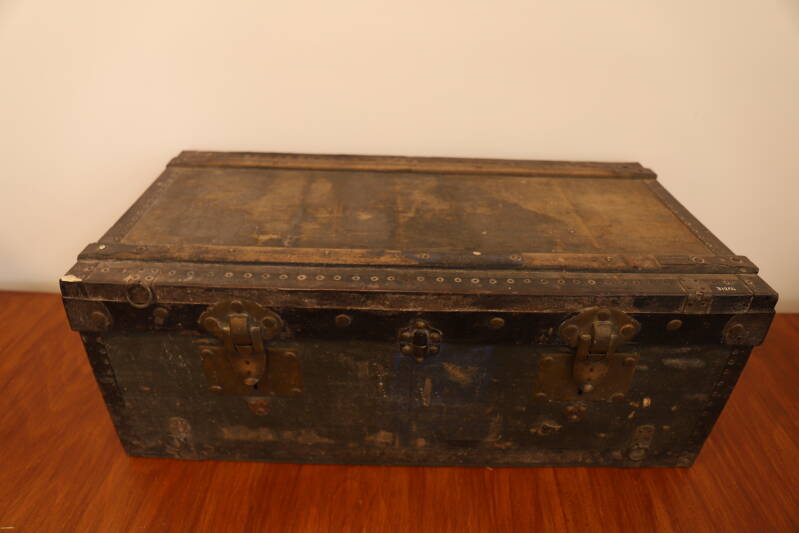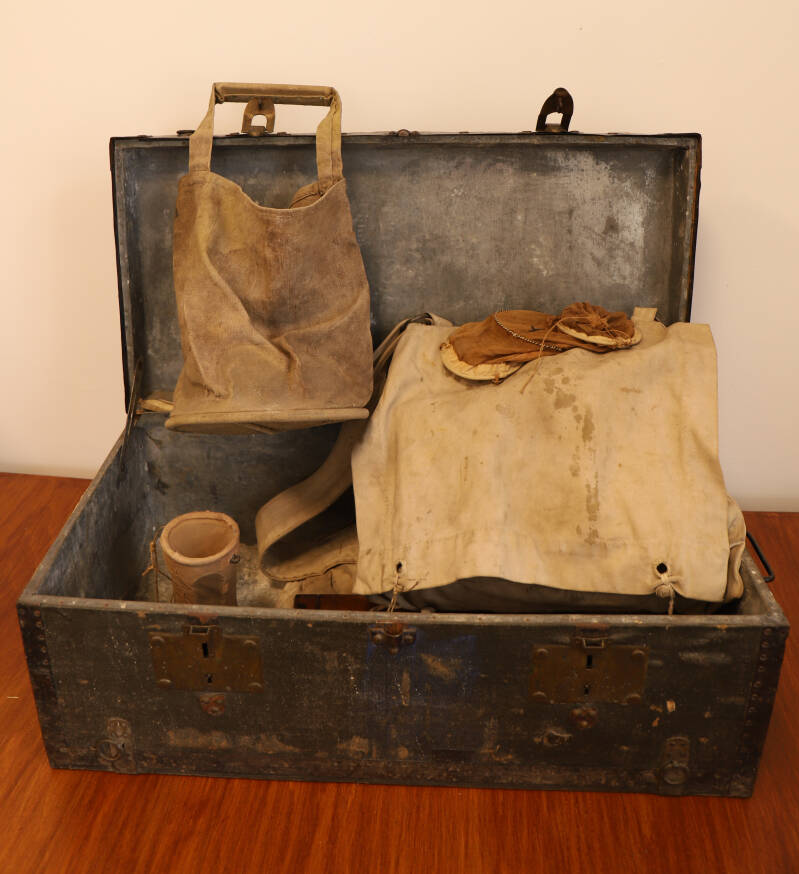 Cufărul pentru echipamentele de teren ale lui Racoviță, îmbrăcat în piele și cu întărituri de alamă