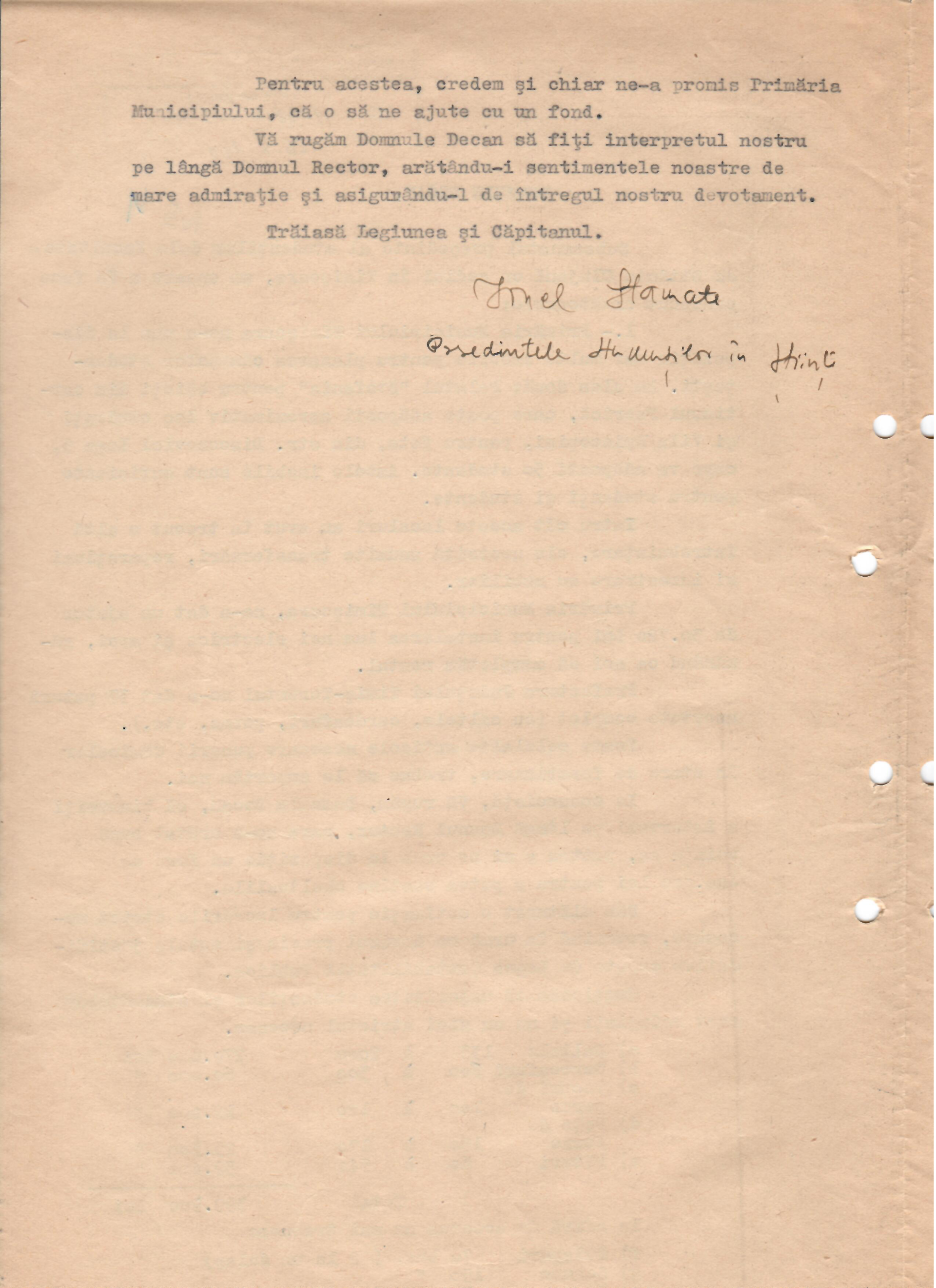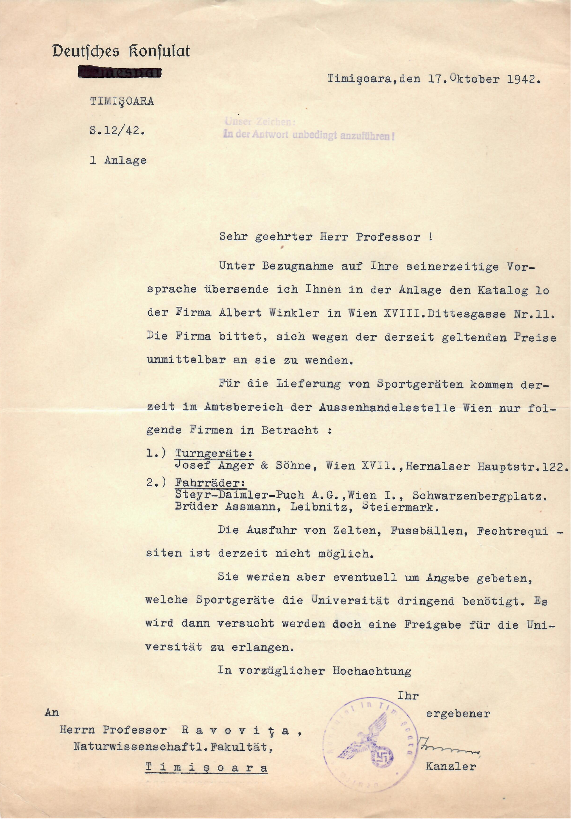 Răspunsul primit de Racoviță în urma unei solicitări de echipamente pentru dotarea sălii de sport a Facultății de Științe