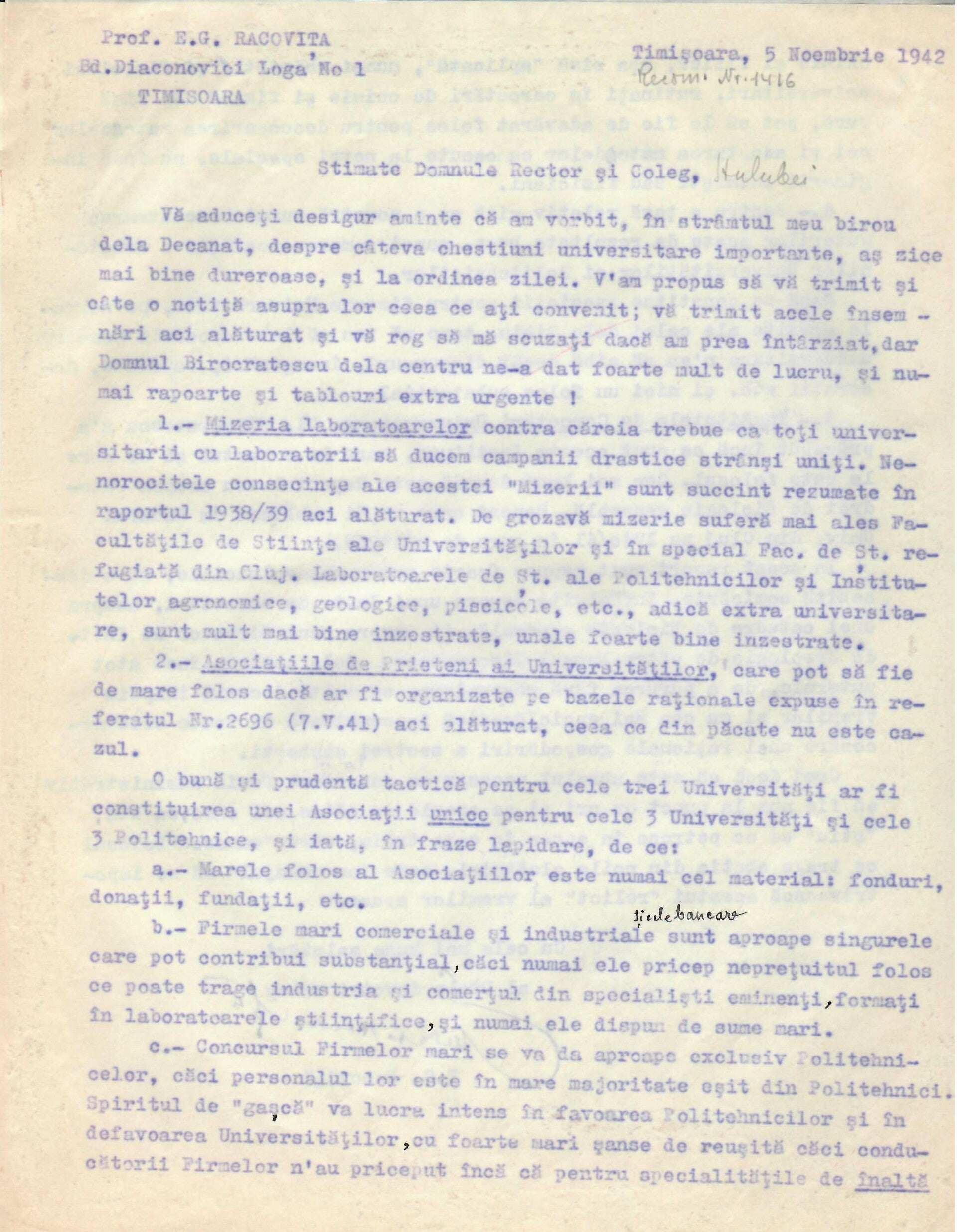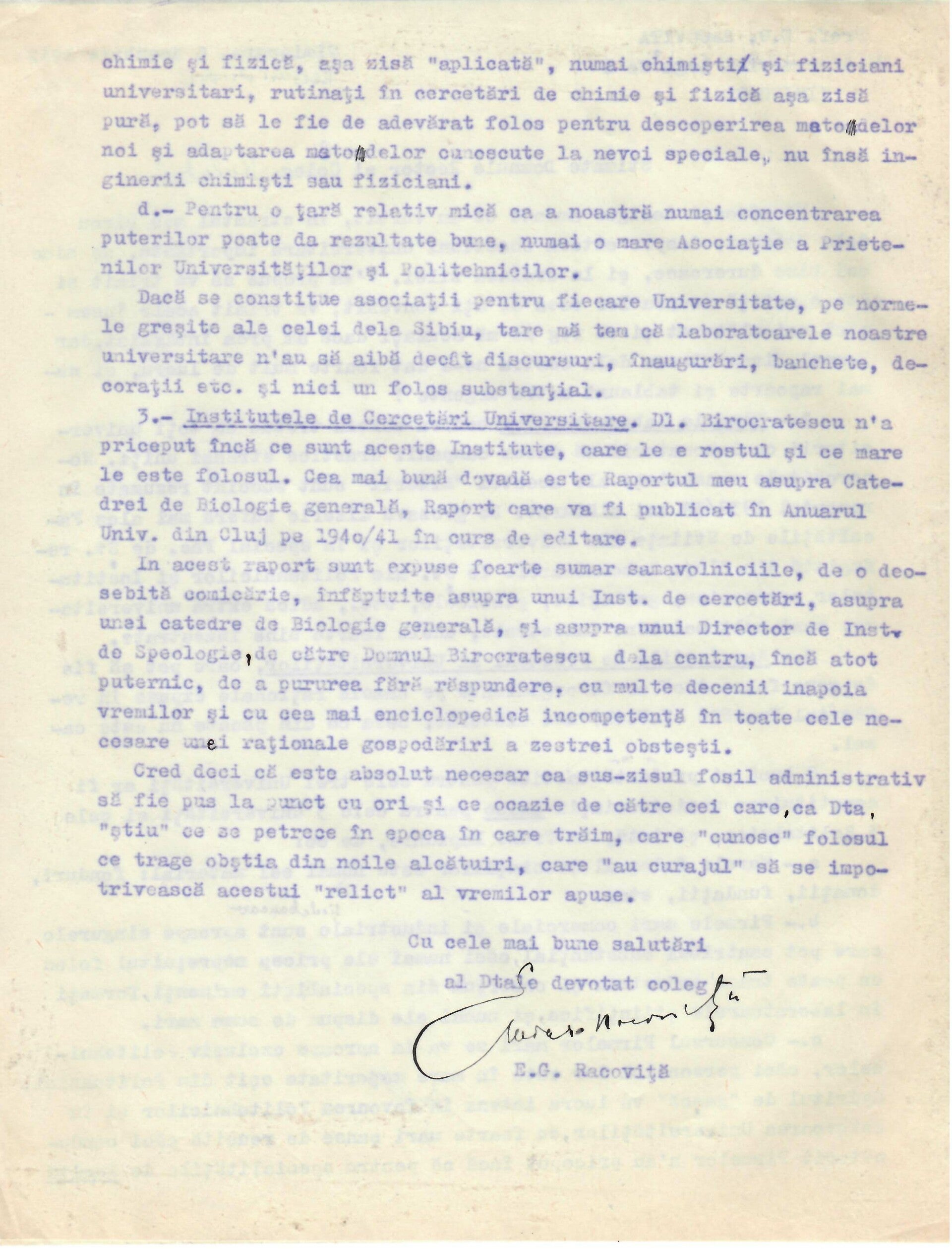 La Timișoara, Racoviță se implică activ în problemele organizatorice și administrative necesare pentru repunerea în funcțiune a Facultății de Științe. În tot acest timp menține vie flacăra primului Institut de Speologie din lume. Aceste lucruri reies din documentele și scrisorile păstrate în Arhiva Institutului de Speologie Cluj. În continuare vă prezentăm câteva dintre aceste documente: